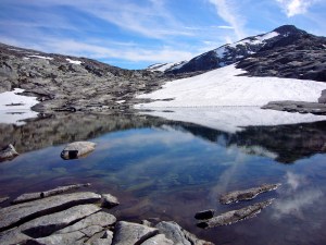 Etter en lang morgenstund med frokost og morgenkaffe i solen utenfor teltet gikk vi innover mot Rondvassbu. Vi fulgte kvistet løype ca 8 km inn- og oppover, og fant en fin teltplass bak en kolle på 406 589. Det var meldt mye vind fra nord og nord-nord-vest, og plassen lå ganske i ly for dette, i tillegg til at det var åpent vann fra en bekk som rant like ved. Perfekt base for noen dager i den vakre fjellheimen!