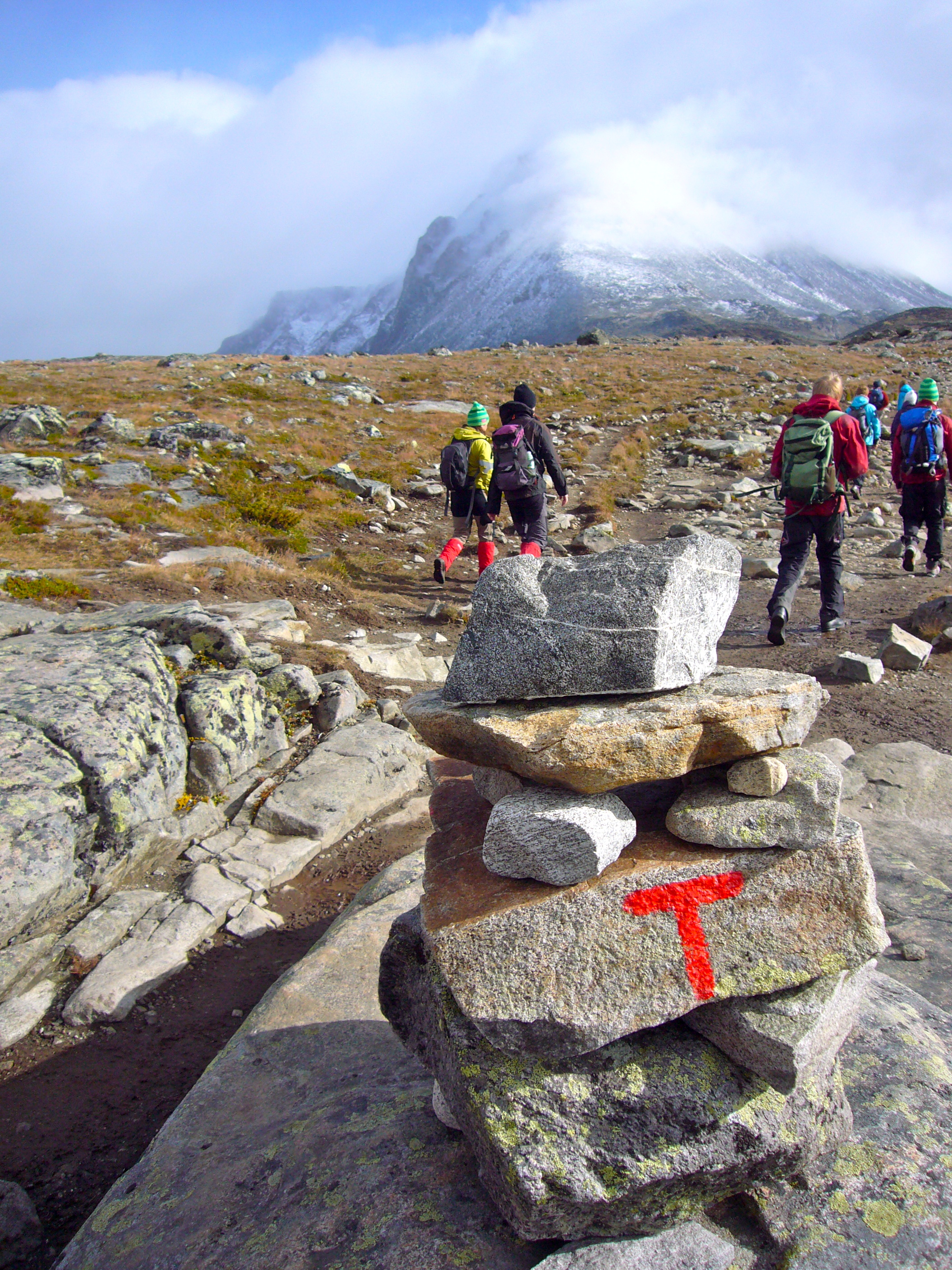 Vi startet å gå fra bunnen av Gaustabanen (1160 moh), kabelbanen som går inne i fjellet opp til Gaustatoppen. Denne stod ferdig i 1959 men åpnet for allmenn turisme først i 2010. Den ble bygget for turisme men bl.a. den kalde krigen bidro til at turistene forsvant. Det ble derfor et NATO anlegg som også etterhvert ga plass til værvarsling og kringkasting. Billettprisen for én tur med banen opp til toppen koster 350 kr (litt rimeligere ved kjøp av klippekort), og den var tydelig populær. Vi var ikke alene om nedkjøringen fra Gaustatoppen den dagen for å si det sånn…