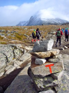 Vi møtte opp på ferjekaia og tok båten til Memurubu kl. 0930, sammen med Besshø-gruppa, ca 30 stykker og tre turledere. Vi startet å gå fra Memurubu ca kl. 1000 og gikk bratt oppover de første 4-500 meterne, samme sti som den som fortsetter over Besseggen. Da vi tok av fra stien og gikk nordover mot Besshø delte gruppa seg i to. 20 av oss gikk videre oppover mot toppen. Vi fulgte sør-eggen rett oppover til toppen. Det var steinete, bratt og urete og de snøen begynte på ca 1600 moh. Men det var herlig å gå, det blåste friskt, sola stakk av og til innom og utsikten var fantastisk når det av og til var litt sprekker i skydekket vi gikk inni. Høydemeterne fløy fort oppover, men da vi nærmet oss toppen begynte vinden å tilta noe voldsomt. Da vi var oppe på platået med toppen, på ca 2200 var vinden så sterk at vi ble blåst over ende. Det ble ingen lang rast på toppen, men vi følte alle at vi hadde fått en god dose alkohol innabords slik som vi sjanglet! Turen nedover var ganske glatt men gikk overraskende bra i steinura. Høsten var så absolutt til stede med all sin prakt av fine farger nedover bjørkeskogen mot Memurubu. Vi rakk akkurat båten som gikk kl. 1640 og var tilbake til Gjendesheim ca 1715. Ca 8 timer totalt t/r Gjendesheim. Da kom regnbuen fram, sola skinte på oss og vi hadde lagt en herlig tur bak oss. Middagen ble tilberedt utenfor teltet og var som seg hør og bør Monas gryte. Og resten av kvelden ble fylt av festivalprogram – men vi kjente turen i både bein og øyne, så vi var langt fra de siste i seng…