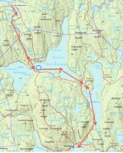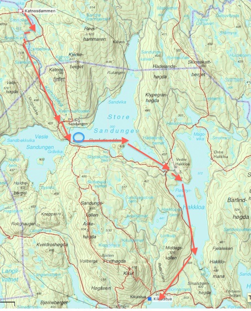 Lørdag 25. juni: Skarvatnet – Buvatn – Pershusvatnet – Finntjern (myr) – Aklangen – Katnosa – Store Sandungen (10 km padling, 1 km sti, 4-6 km vei)