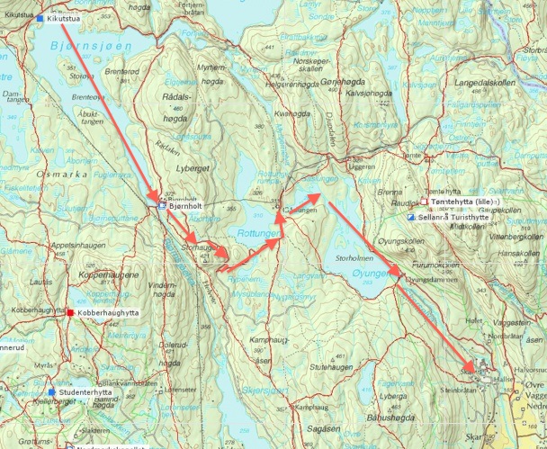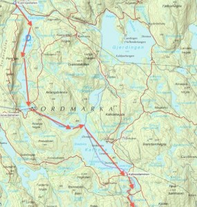 Ruta vår gjennom Nordmarka er tegnet inn med rød pil på kartene under, mens overnattingsplassene våre er tegnet inn med blå sirkler. Det var utrolig mange fine telt- og lunsjplasser underveis, så det var bare å velge og vrake. I tillegg var det lyst hele døgnet, masse fuglesang og nydelige markblomster i grøftekanten. En ideell tid for turen!