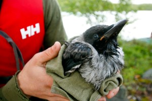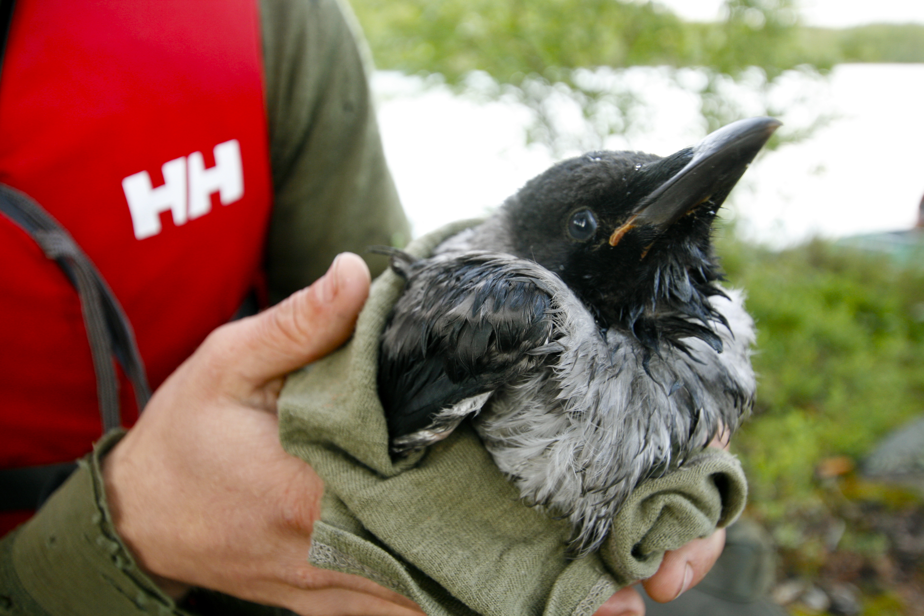 Vi padla til nærmeste, bittelille øy på Skarvatnet – rett vest for den lille hytta på østsiden av vannet – hvor vi slo leir. Der var det ingen mygg, og nesten ikke ved, så Fredrik og Marte padlet på vedjakt mens jeg og Mari startet på middagen. Klokka var ni-halv ti. Da de kom tilbake med ved hadde de sannelig reddet nok en fugleunge fra vannet. Denne ganga var det en liten kråkeunge som både fikk pledd (ullhals) og lue (pulsvante) å varme seg på før vi satte den tilbake til mor.