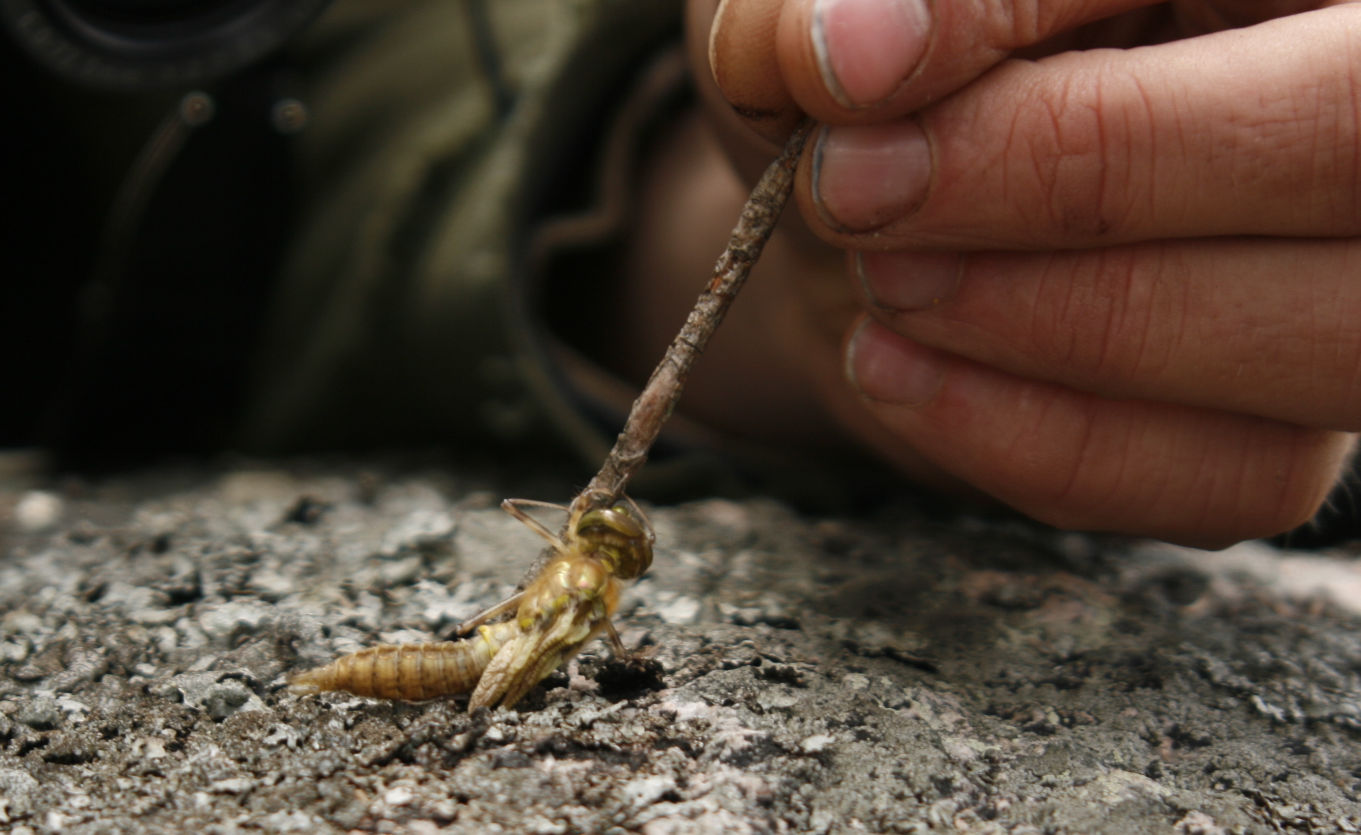 Våknet opp til en fin morra, og tok et morrabad. Litt kaldt, men forfriskende. Det blåste litt, men ga seg utover formiddagen. En lang frokost med speilegg og kaffe. Fint å ikke ha noe hast. I det vi skulle pakke sammen oppdaget jeg at det var kommet et stort insekt i skoen min – en libelle (?) (øyenstikker) som gikk ut av skallet sitt, og var igang med å blåse opp vingene. Vi fikk være tilskuere til en av biologiens spennende prosesser, og ble svært så fascinert av den lille, så det tok en stund før vi var på vannet.
