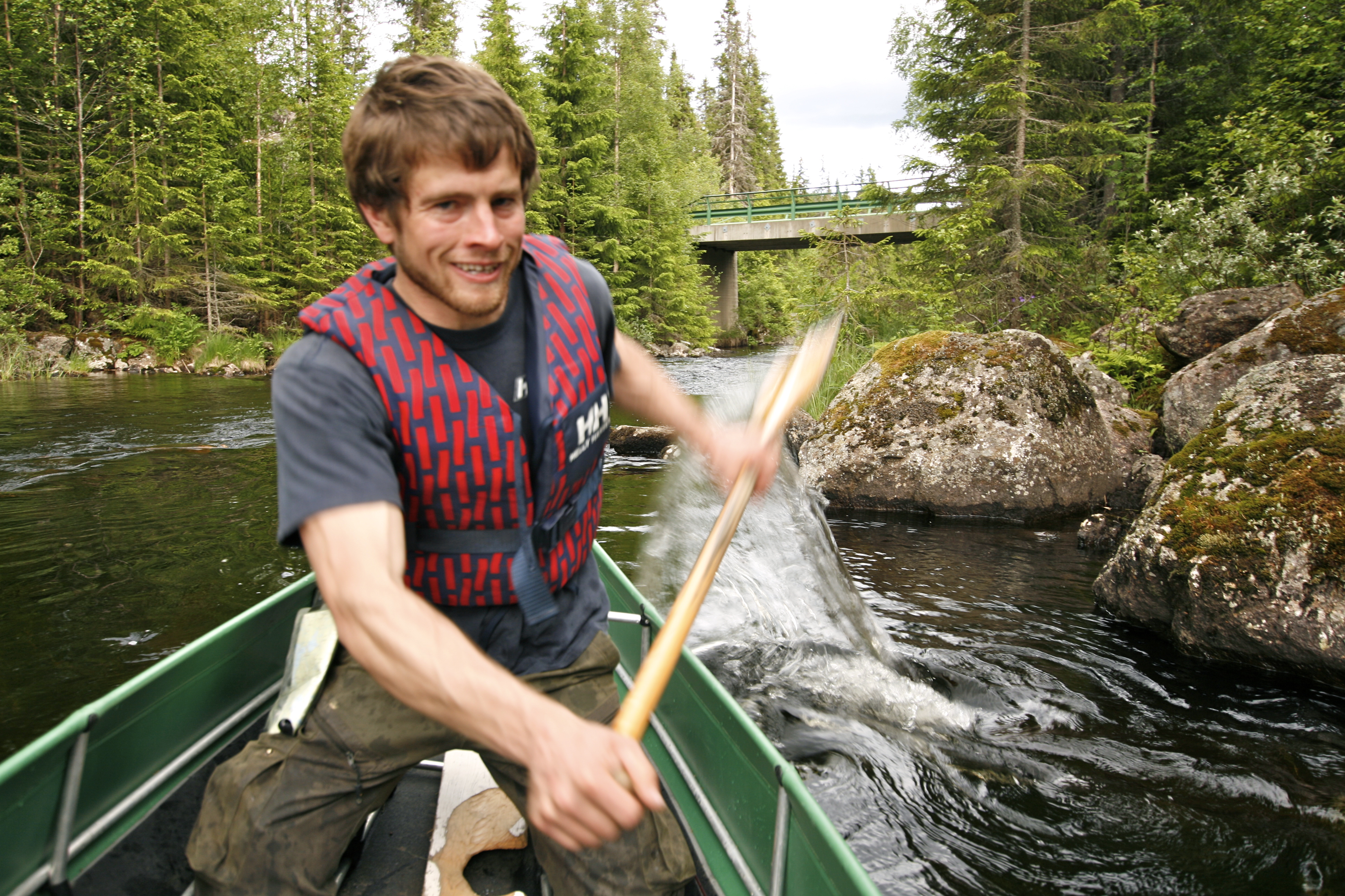 Kanotur på elva Sølna. Fra late svingerog stille vann til lekne stryk gjennom rolig landskap i et nydelig område med fjellene Elgspiggen i nord og Sølnmassivet i sør.